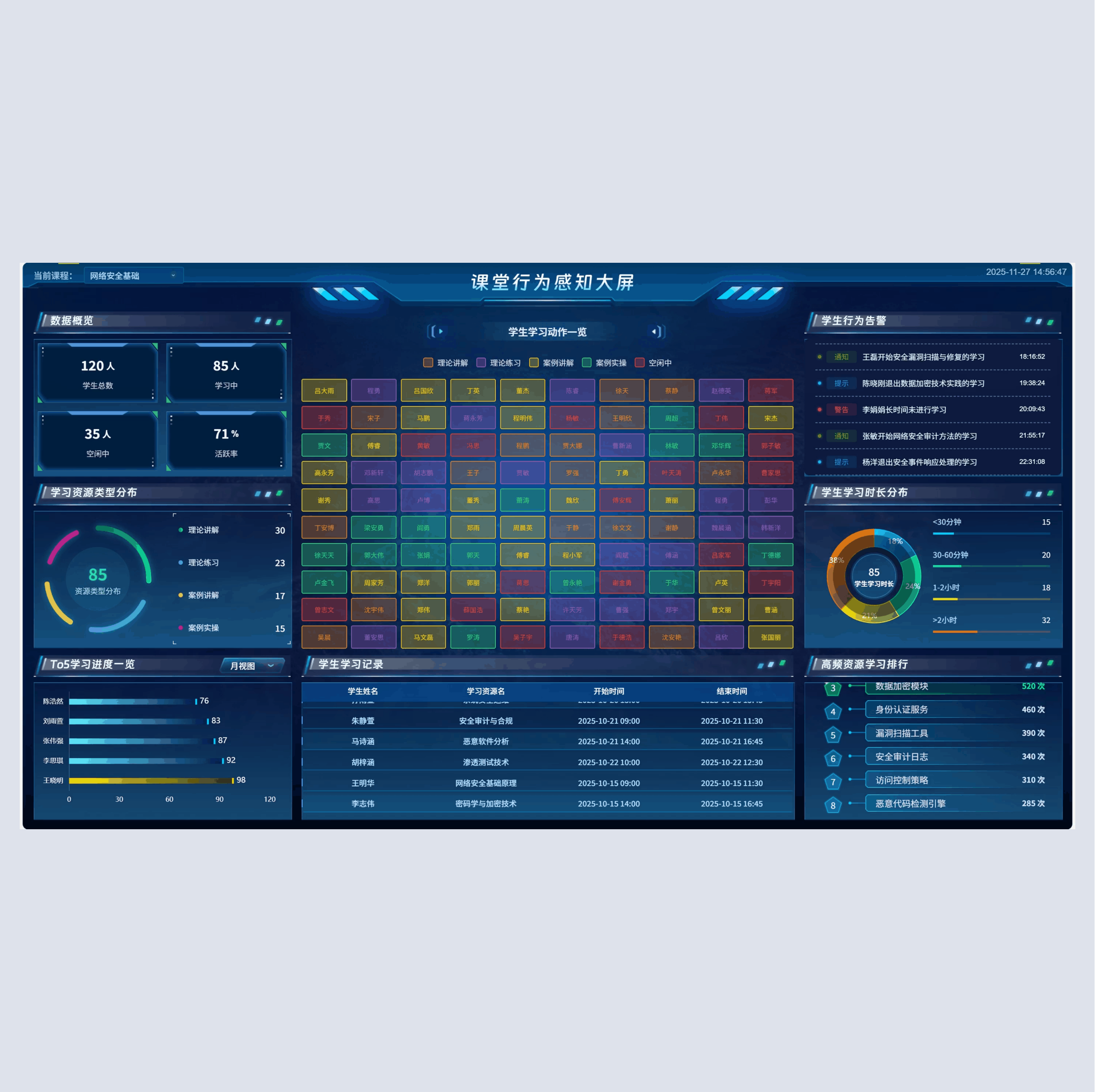 教学驾驶舱是凯发k8国际问课平台的智能指挥中心,整合教学全流程数据,顺利获得可视化仪表盘的形式,为教师与教学管理者给予全面、实时的教学情况反馈。驾驶舱涵盖多维度数据指标,包括实时学习总人次、今日学习人次、学生总数、班级总数、各类型资源学习占比、热门课程学习排名、难点任务统计、学生活跃度趋势、各时段学习人次分布等。